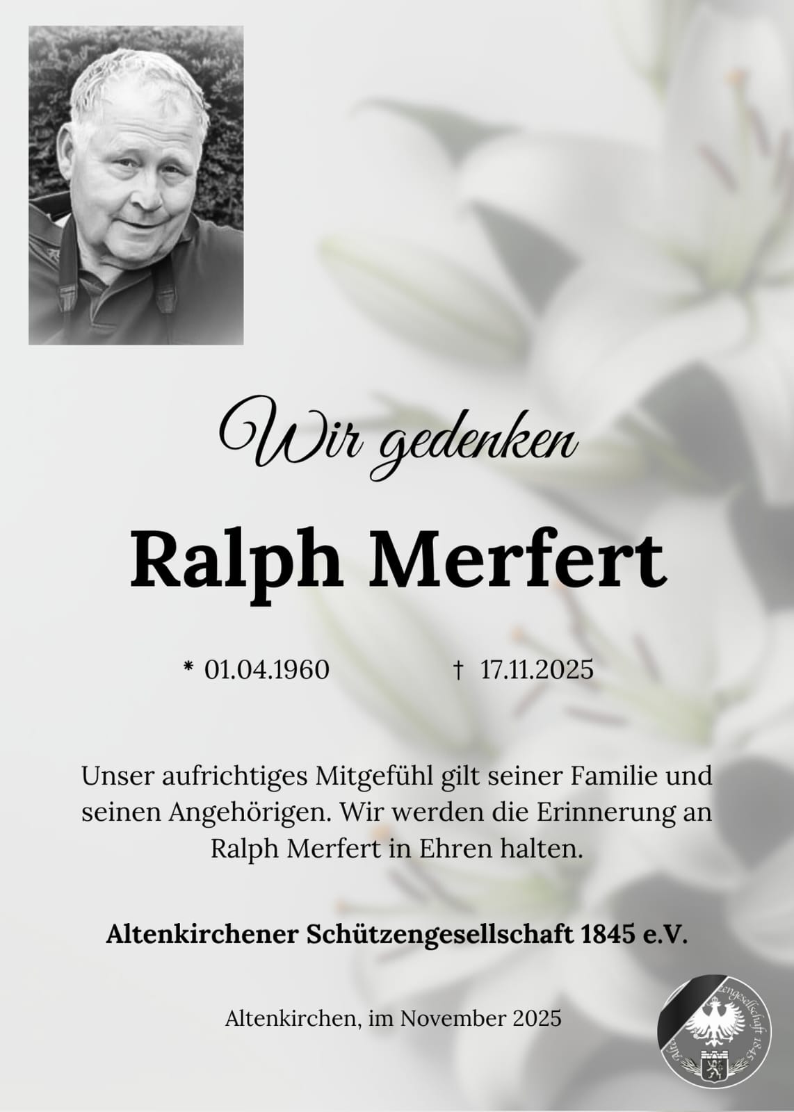 Die Altenkirchener Schützengesellschaft trauert um ihr langjähriges und hochgeschätztes Mitglied Ralph Merfert, der im Alter von 65 Jahren viel zu früh verstorben ist.