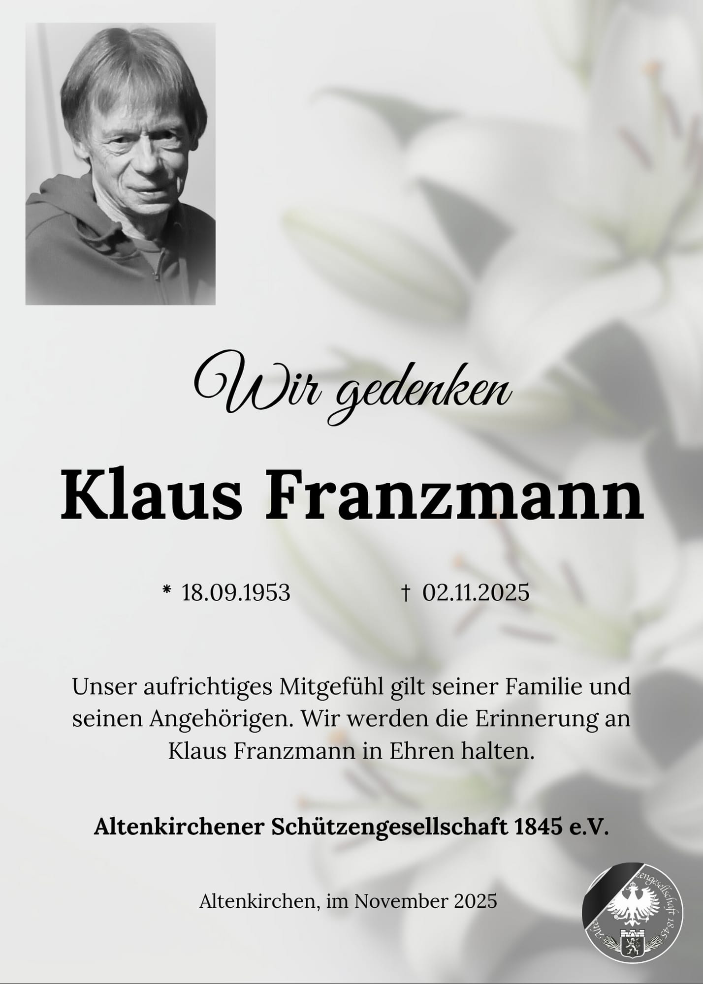 Die Altenkirchener Schützengesellschaft trauert um ihr Ehrenmitglied Klaus Franzmann, der mit 72 Jahren viel zu früh verstarb.