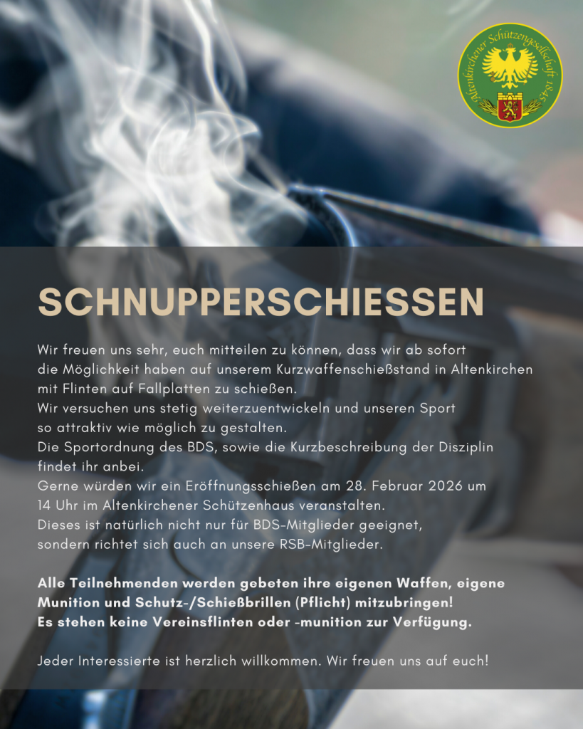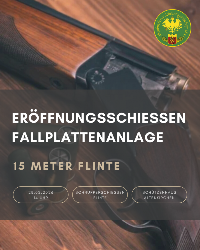 Am Samstag, 28. Februar 2026, findet um 14:00 Uhr im Altenkirchener Schützenhaus das Eröffnungsschießen unserer Fallplattenanlage statt.