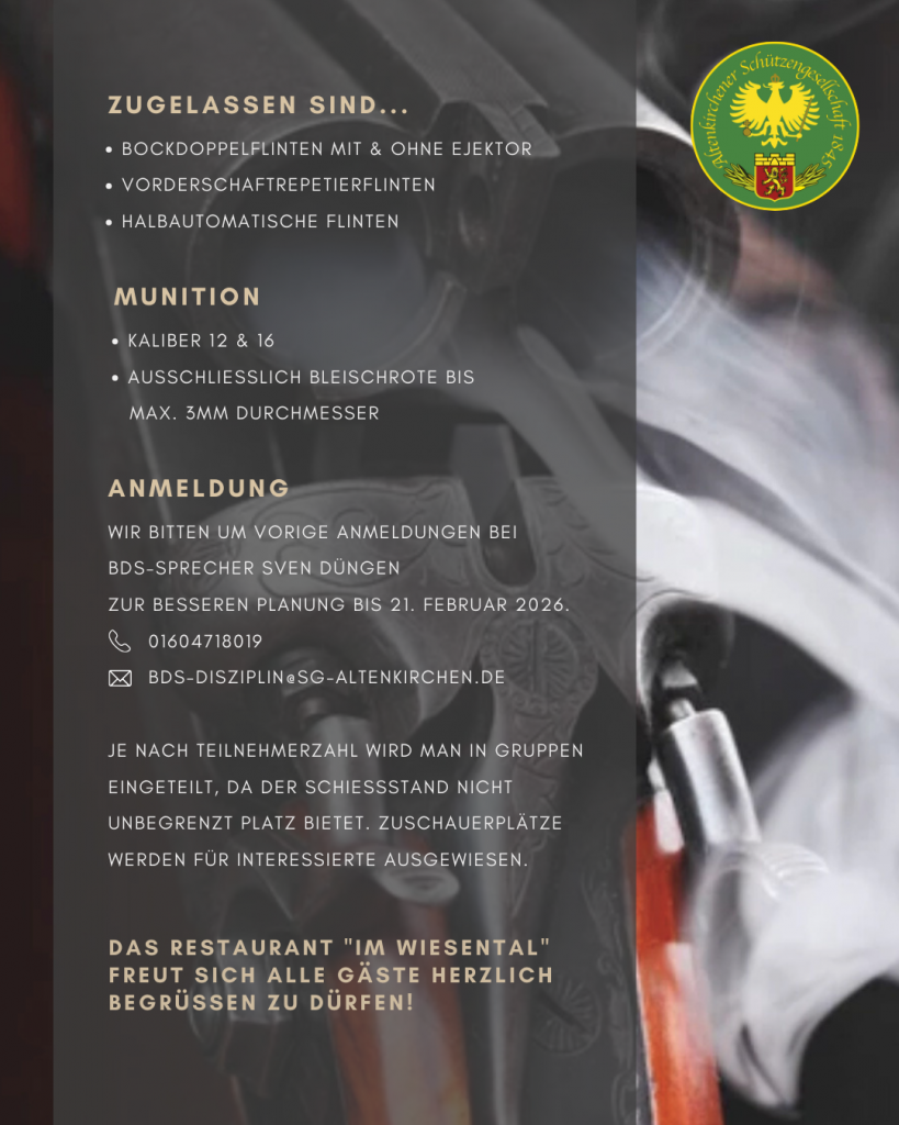 Alle wichtigen Informationen, zugelassene Waffentypen und Munitionsvorgaben findest du in den Bildern.
